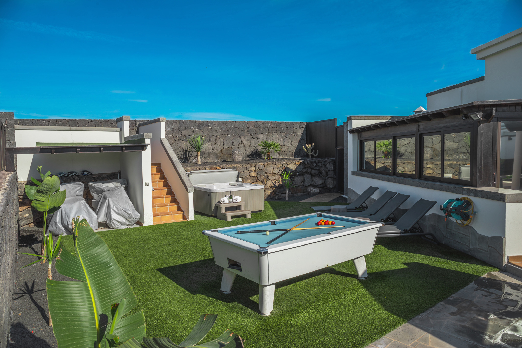 The villa has a heated pool (7.5m x 3.5m) and a luxurious hot tub/spa, an extensive South facing sun terrace, perfect for relaxing and soaking up the sunshine, a secondary patio/barbecue area and, for the hustlers & sharks amongst you, a full size, slate bed, American style pool table, there's also a putting green for the golf enthusiasts, so you can keep your eye and swing in check.